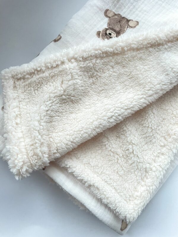 Zapewnij swojemu maluszkowi wyjątkowe ciepło i miękkość dzięki kocykowi dziecięcemu z uroczym wzorem brązowych misiów na delikatnym muślinie (100% bawełna) oraz mięciutką stroną z materiału imitującego „miś baranek” w kolorze ecru (100% poliester).